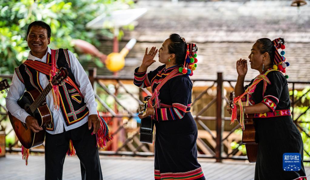 在云南省普洱市澜沧拉祜族自治县老达保村,致富带头人、拉祜族村民李娜倮(中)带领村民演出(2022年7月5日摄)。