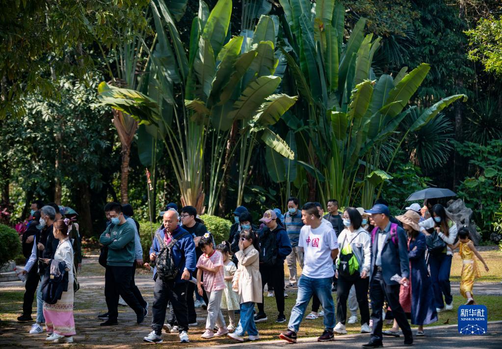 游客在位于云南省西双版纳州勐腊县勐仑镇的中国科学院西双版纳热带植物园内游览(2023年2月12日摄)。