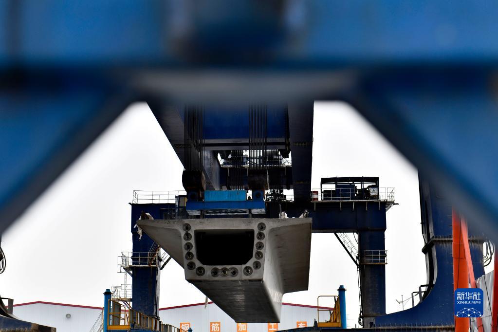 4月13日,在济郑高铁中铁十局济南西制梁场,提梁机在转运箱梁。