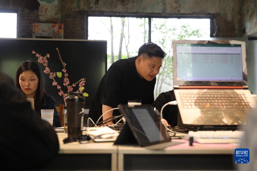 4月12日,程铄钦和创业团队成员在办公室内交流。