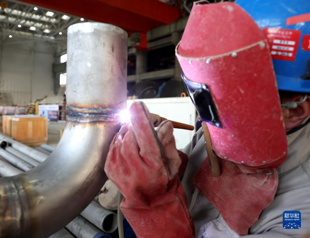 4月13日,一名工人在江苏省射阳县射阳港电厂四期百万千瓦燃煤发电机组1号汽轮机组设备安装现场进行焊接工作。