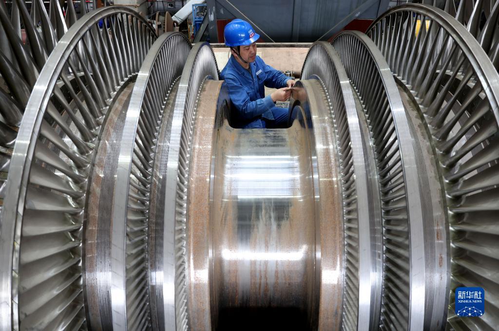 4月13日,一名工人在江苏省射阳县射阳港电厂四期百万千瓦燃煤发电机组1号汽轮机组设备安装现场工作。
