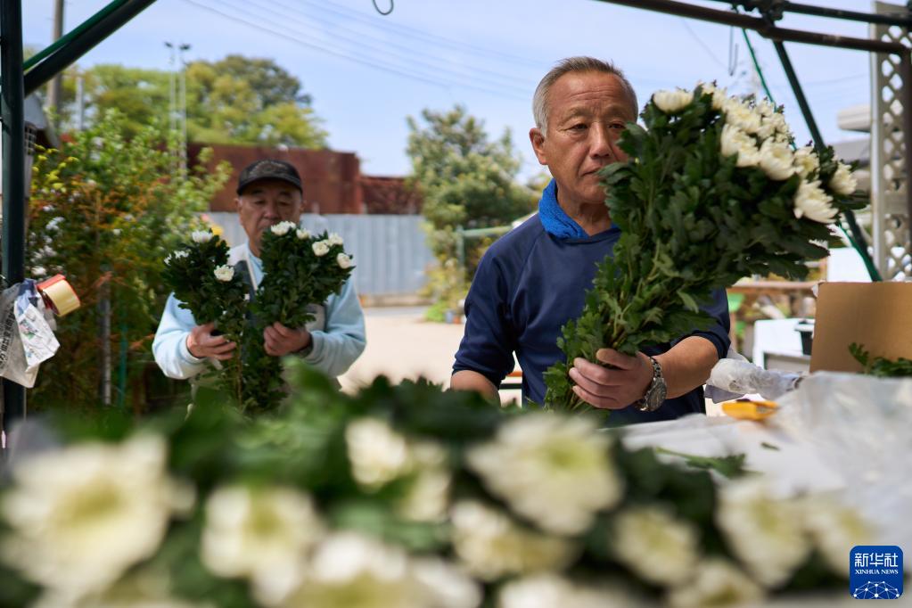 在日本埼玉县埼玉市的园艺中心,工人开箱检查到货的中国云南进口鲜花(4月5日摄)。