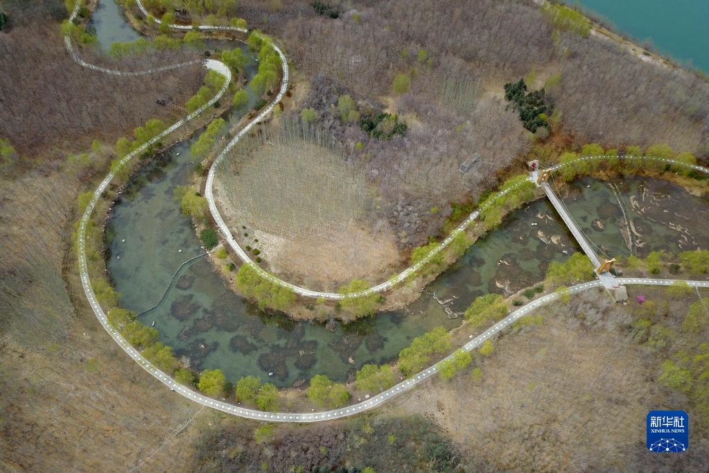 这是4月13日拍摄的张掖市芦水湾生态景区内春日景色(无人机照片)。