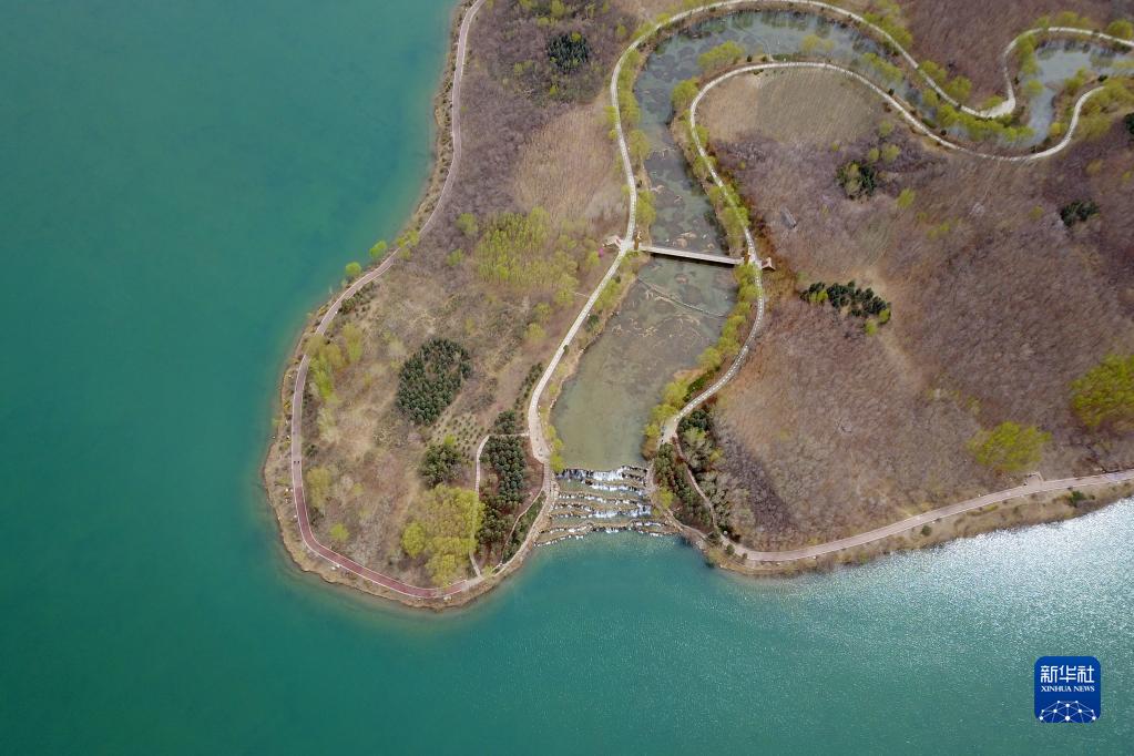 这是4月13日拍摄的张掖市芦水湾生态景区内春日景色(无人机照片)。