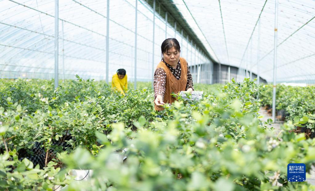 4月13日,山东省临沂市临沭县大兴镇一处蓝莓种植大棚内,农民在采摘蓝莓。