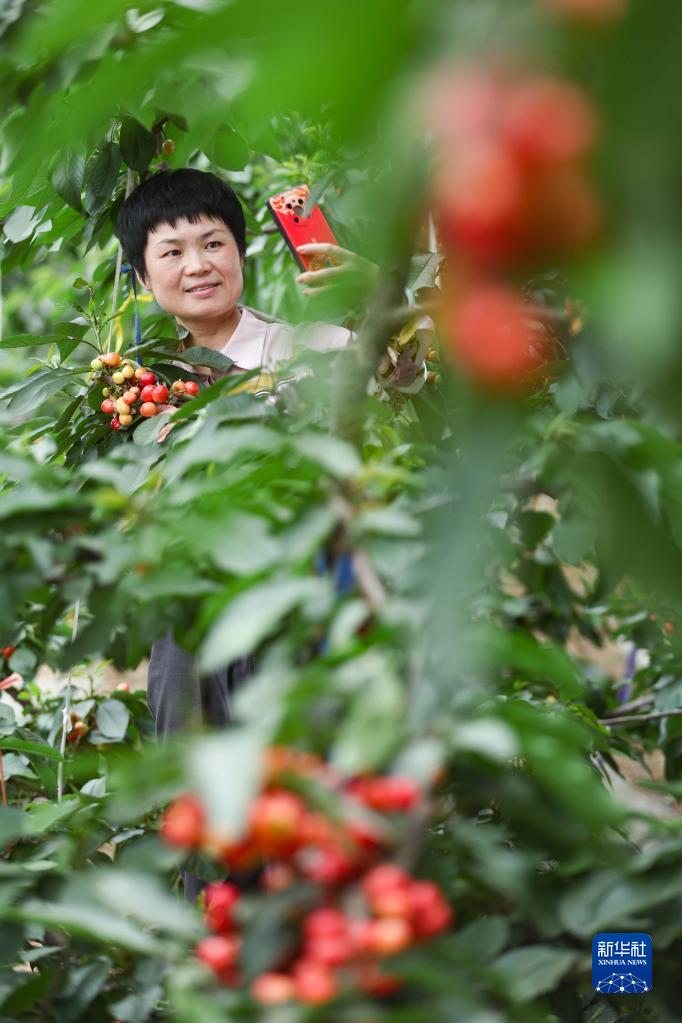 4月13日,游客在山东省临沂市临沭县大兴镇一处樱桃种植大棚内拍照。