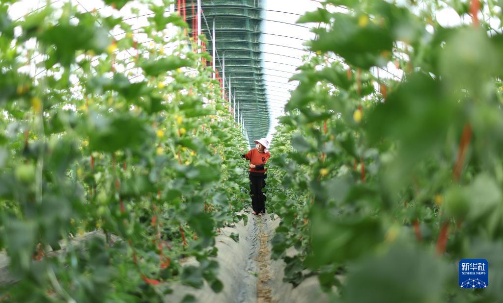 4月13日,农民在山东省临沂市临沭县大兴镇一处甜瓜种植大棚内进行田间管理。