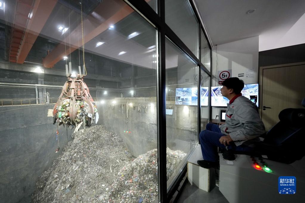 4月13日,工作人员在唐山冀东启新水泥有限责任公司固废处置中心内操作机器运输生活垃圾。
