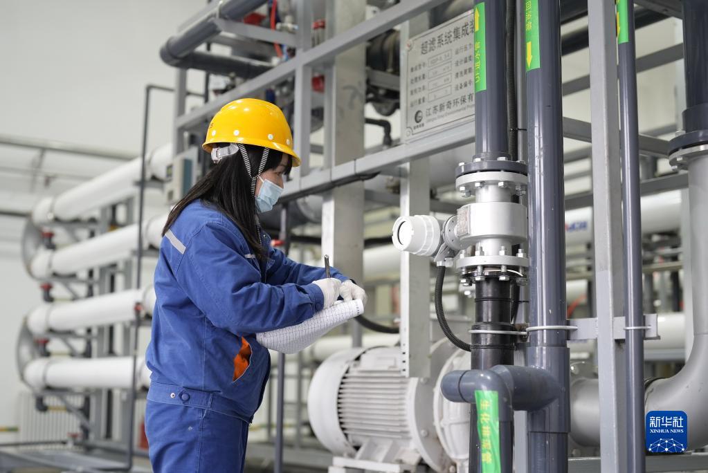 4月13日,工作人员在唐山冀东启新水泥有限责任公司渗液处理站内记录设备运转情况。该处理站可将生活垃圾产生的渗滤液经处理后转化为工业用水。