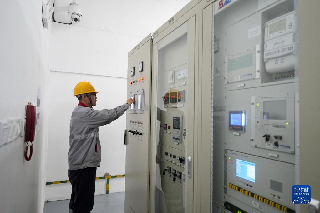 4月13日,工作人员在唐山冀东启新水泥有限责任公司水泥窑协同处置综合固废及余热发电循环产业项目区内查看发电机功率因数。