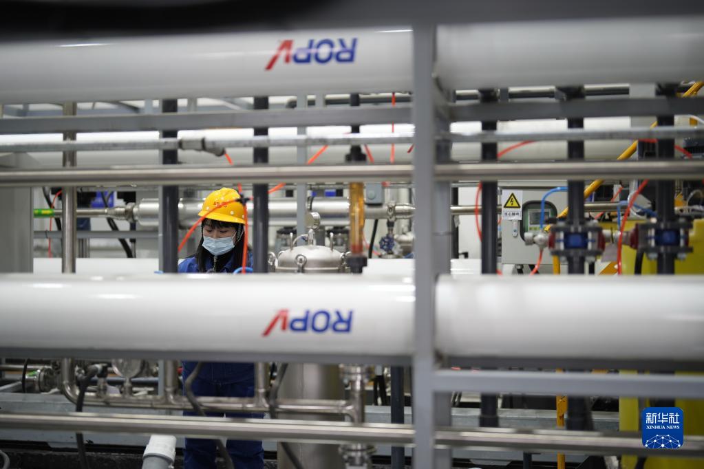 4月13日,工作人员在唐山冀东启新水泥有限责任公司渗液处理站内查看水净化设备运行情况。该处理站可将生活垃圾产生的渗滤液经处理后转化为工业用水。
