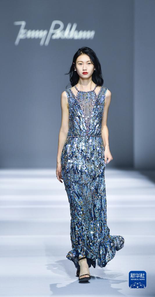 4月11日,模特在消博会时装周主秀场展示时装作品。
