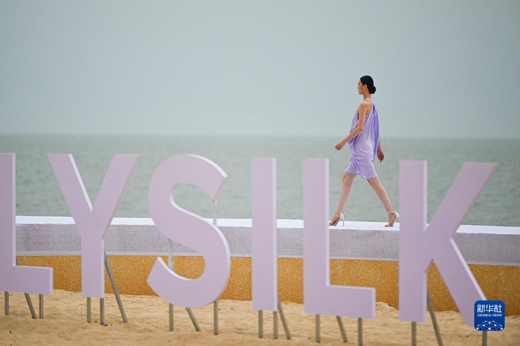 4月12日,模特在消博会时装周海边秀场展示时装作品。