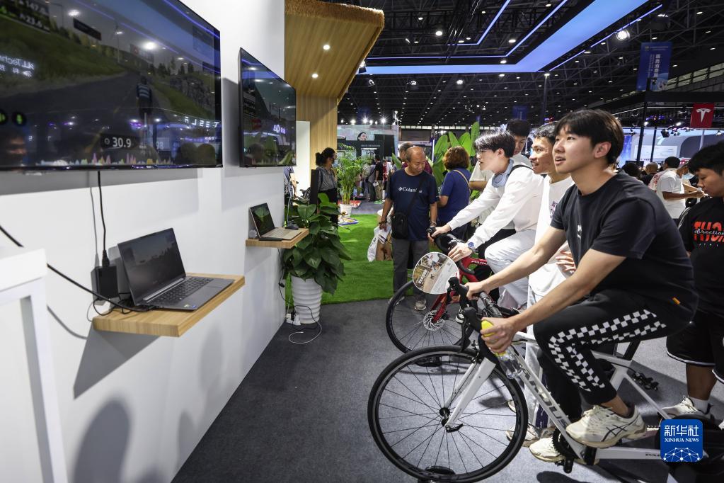 4月14日,观众在消博会现场体验智能骑行。
