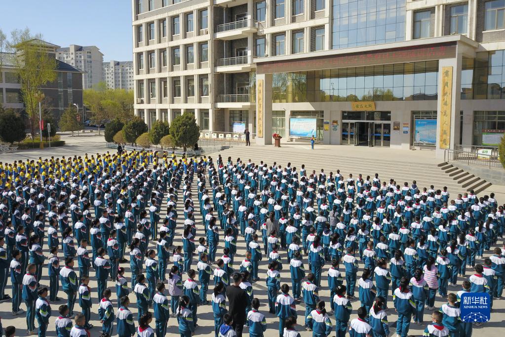 4月14日,在张掖市甘州区大成学校,学生们参加全民国家安全教育日国旗下演讲(无人机照片)。