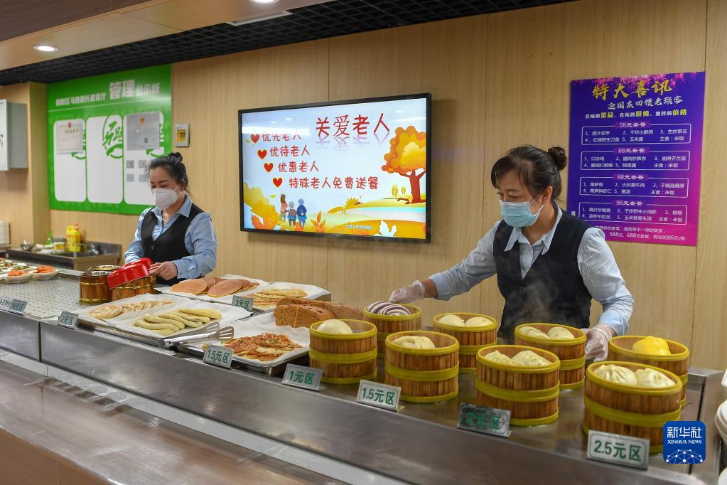 4月11日,在吉林省长春市朝阳区光明社区食堂,工作人员在摆放菜品。该食堂是吉林省民政厅重点支持的100个社区老年食堂之一。