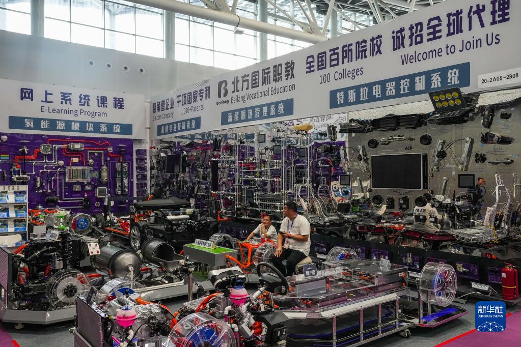 这是一家参展企业在新能源及智能网联汽车出口展区设置的交易展台(4月14日摄)。