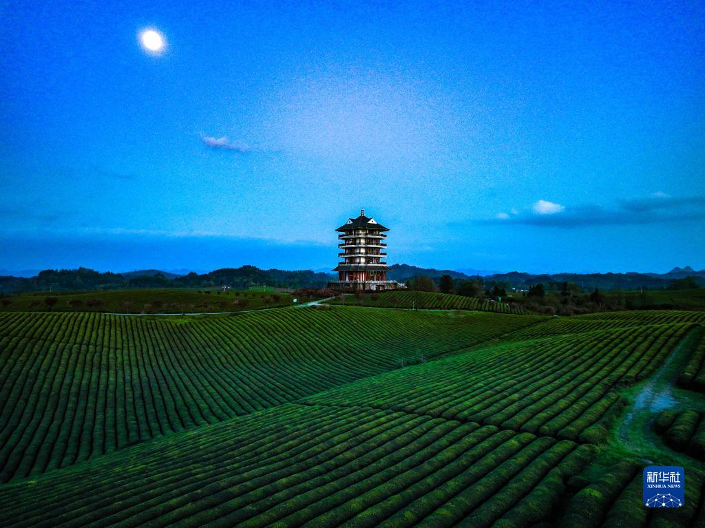 4月4日在遵义市湄潭县永兴镇拍摄的月光下的“万亩茶海”(无人机照片)。