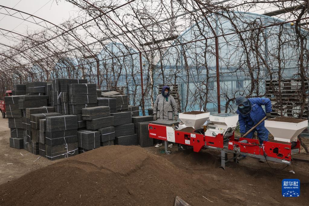 4月14日,盘锦市盘山县的农户在进行水稻秧苗育苗工作。