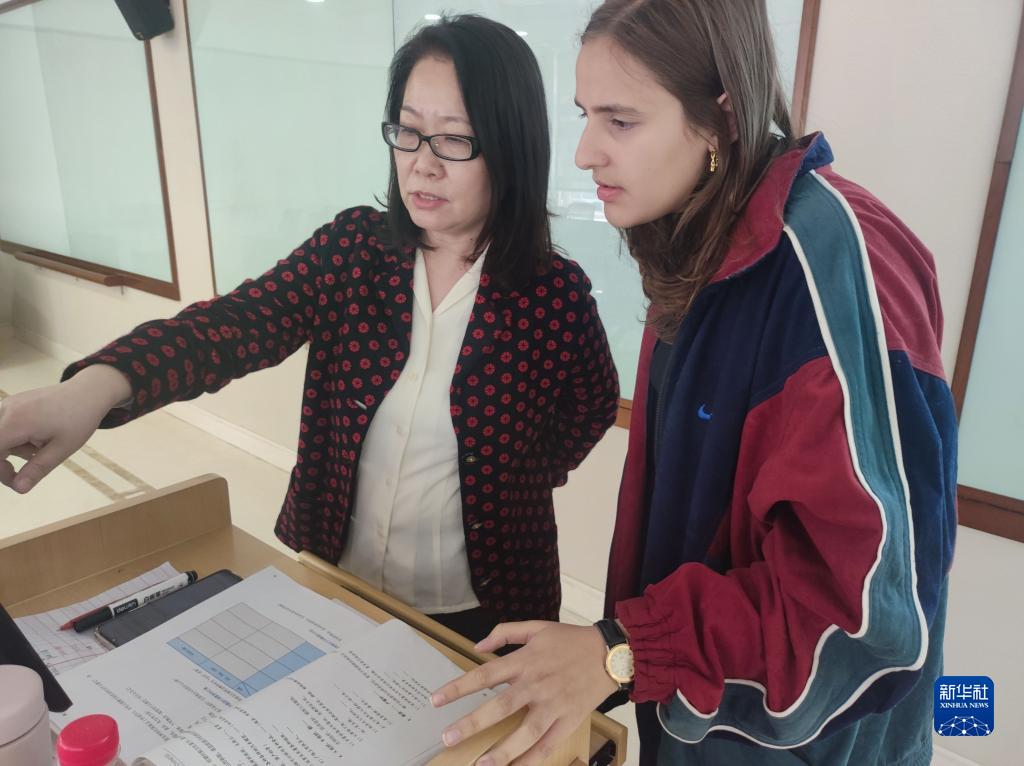 3月31日,在北京大学,微微(右)在中文课后与老师交流(手机照片)。
