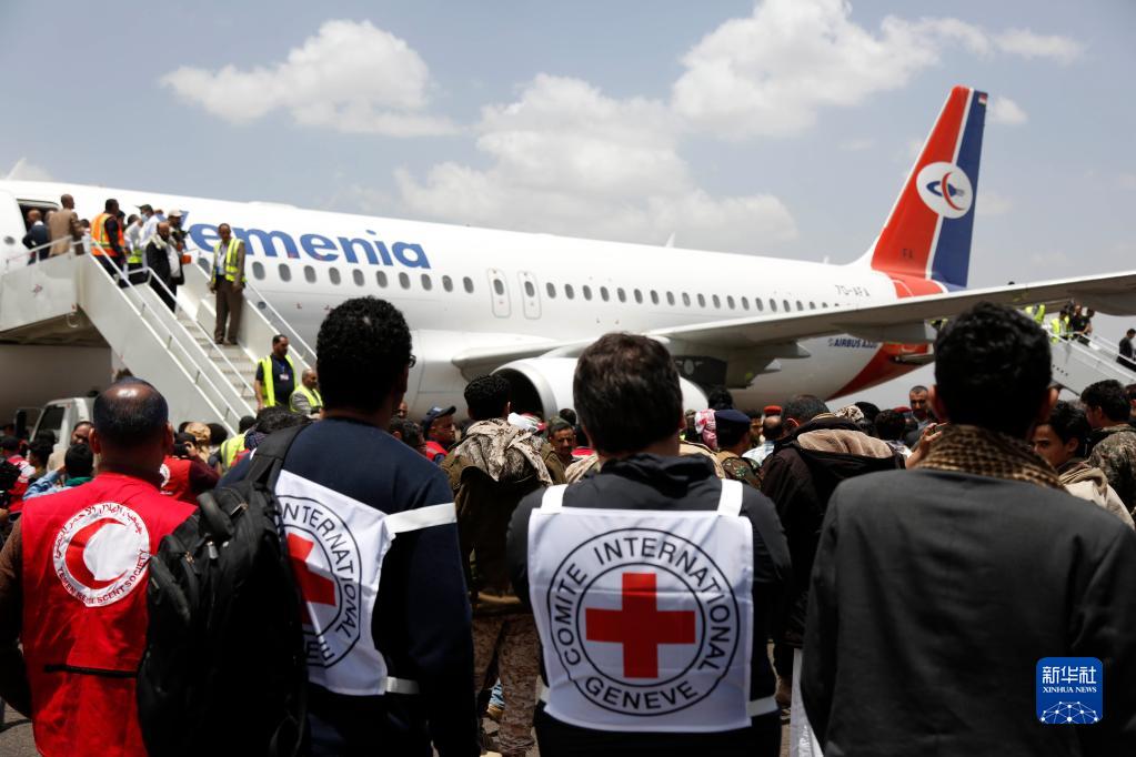 4月14日,搭载获释胡塞武装成员战俘的飞机抵达也门萨那机场。