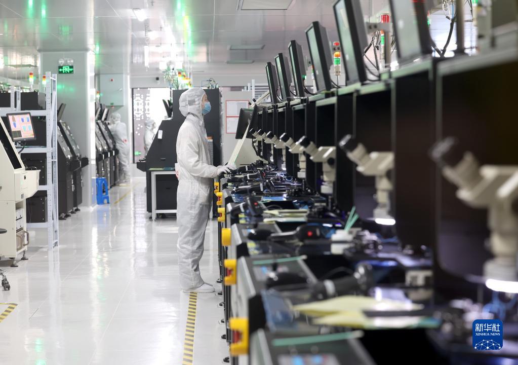 4月14日,一位工人在江苏省射阳县江苏暖阳半导体科技公司LED芯片生产车间工作。