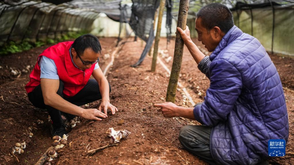 4月14日,农技工作者在六盘水市钟山区汪家寨镇那罗村查看皱环球盖菇的种植情况。