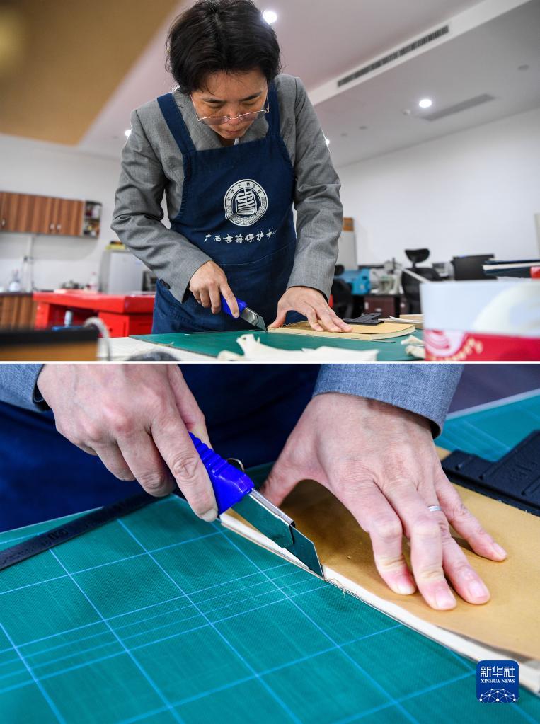 拼版照片:4月14日,在广西壮族自治区图书馆古籍保护中心的工作室内,黄玉杏给修补好的古籍裁边。