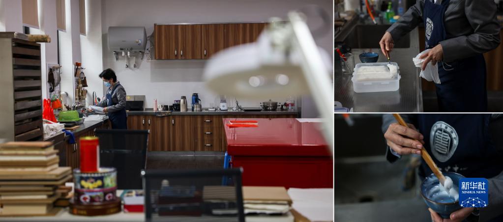 拼版照片:4月14日,在广西壮族自治区图书馆古籍保护中心的工作室内,黄玉杏在修补工作开始前调制浆糊。
