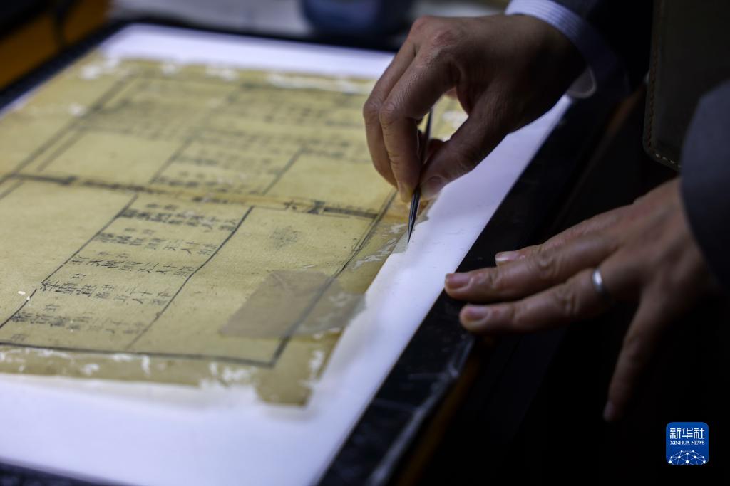 4月14日,在广西壮族自治区图书馆古籍保护中心的工作室内,黄玉杏使用镊子修补古籍。