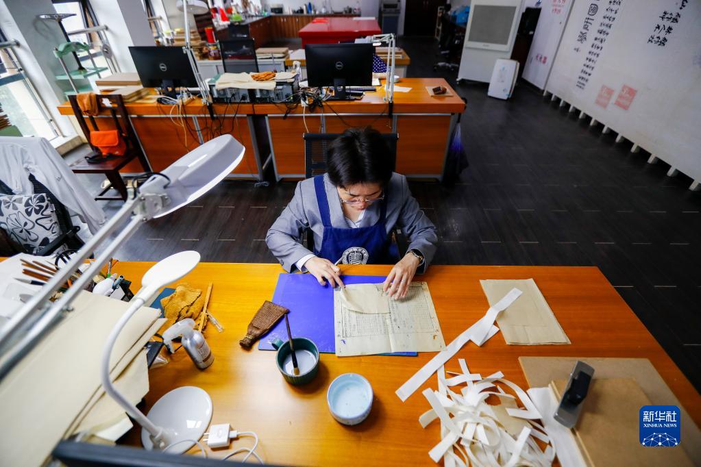 4月14日,在广西壮族自治区图书馆古籍保护中心的工作室内,黄玉杏正在修复古籍。