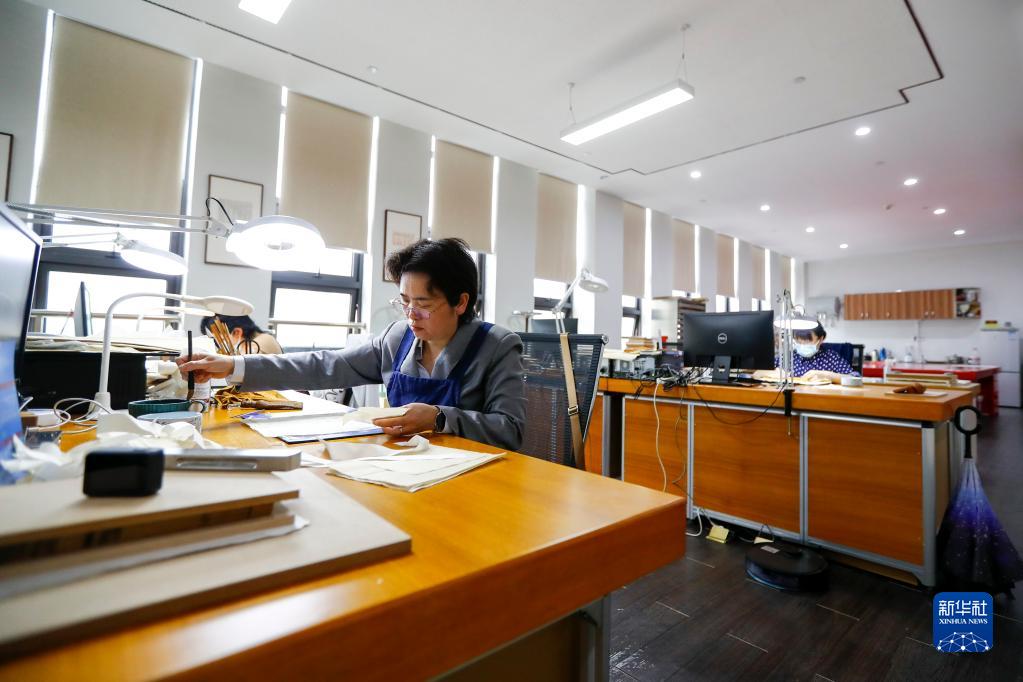 4月14日,在广西壮族自治区图书馆古籍保护中心的工作室内,黄玉杏正在修复古籍。