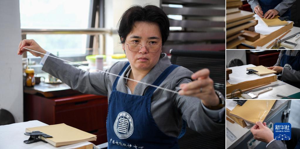 拼版照片:4月14日,在广西壮族自治区图书馆古籍保护中心的工作室内,黄玉杏给修补好的古籍钉线。