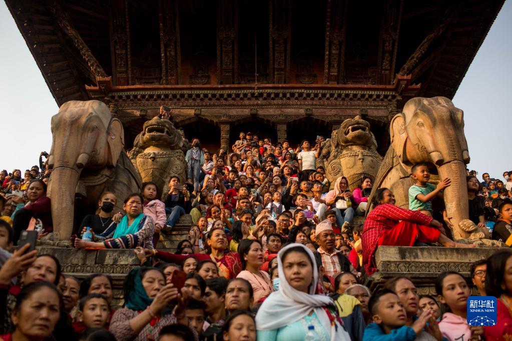 4月10日,人们聚集在尼泊尔中部加德满都谷地的巴克塔普尔观看传统的新年庆典。