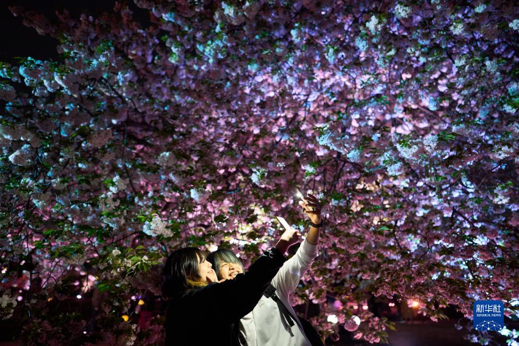 4月10日,游客在日本东京新宿御苑举行的樱之灯光秀活动中自拍。