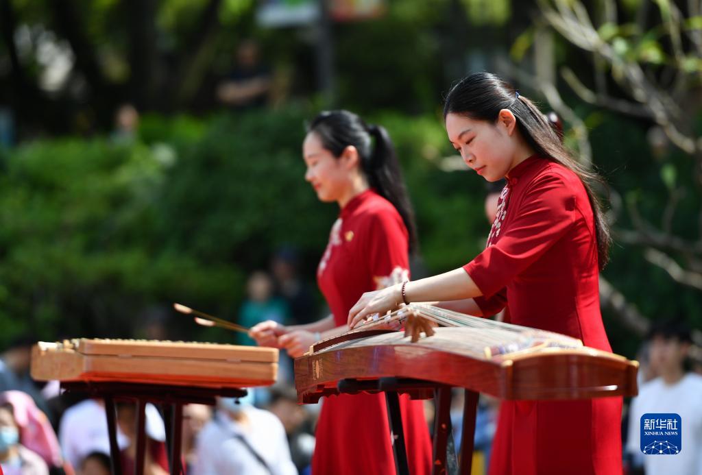 4月15日,演员在2023年福州西湖上巳节启动仪式现场表演中国传统乐器。