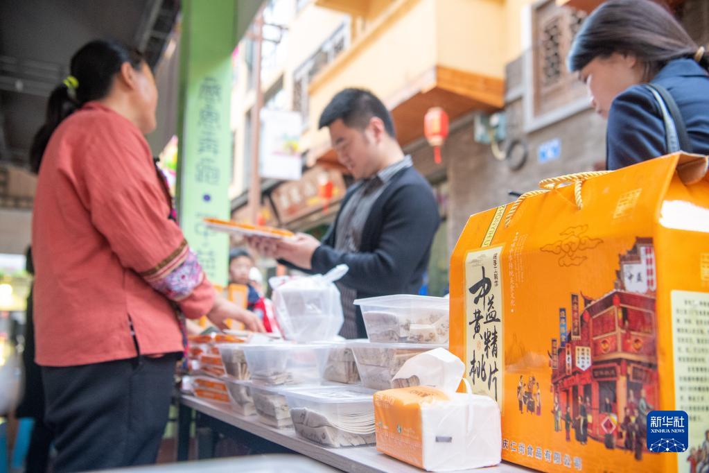 4月13日,在重庆市石柱县中益乡,游客在选购黄精加工产品。