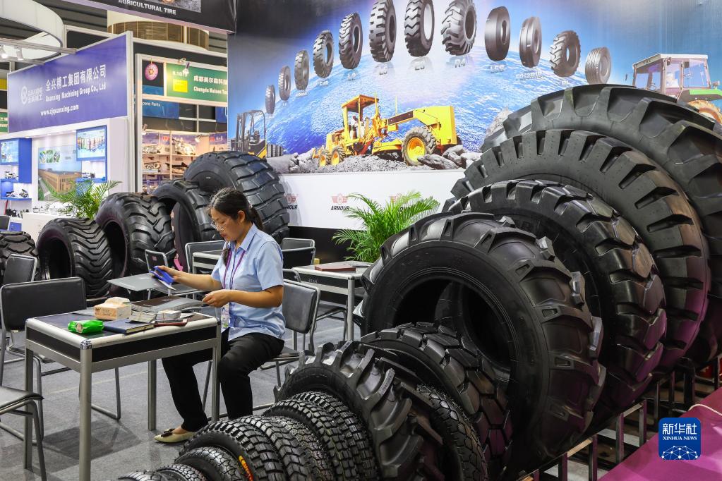 参展商在广交会汽配展区展示的轮胎产品(4月15日摄)。