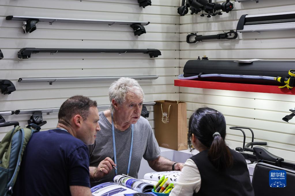 4月15日,来自英国的采购商在广交会汽配展区洽谈行李架产品。