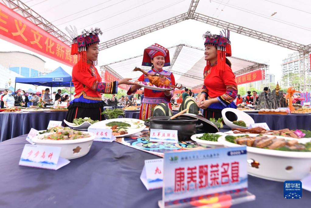 当日,广西河池市大化瑶族自治县举办“美味三月三”美食大赛,当地各族群众以糯米、七百弄鸡、山羊、河鱼等当地特色食材制作的数百道美食参加评比。