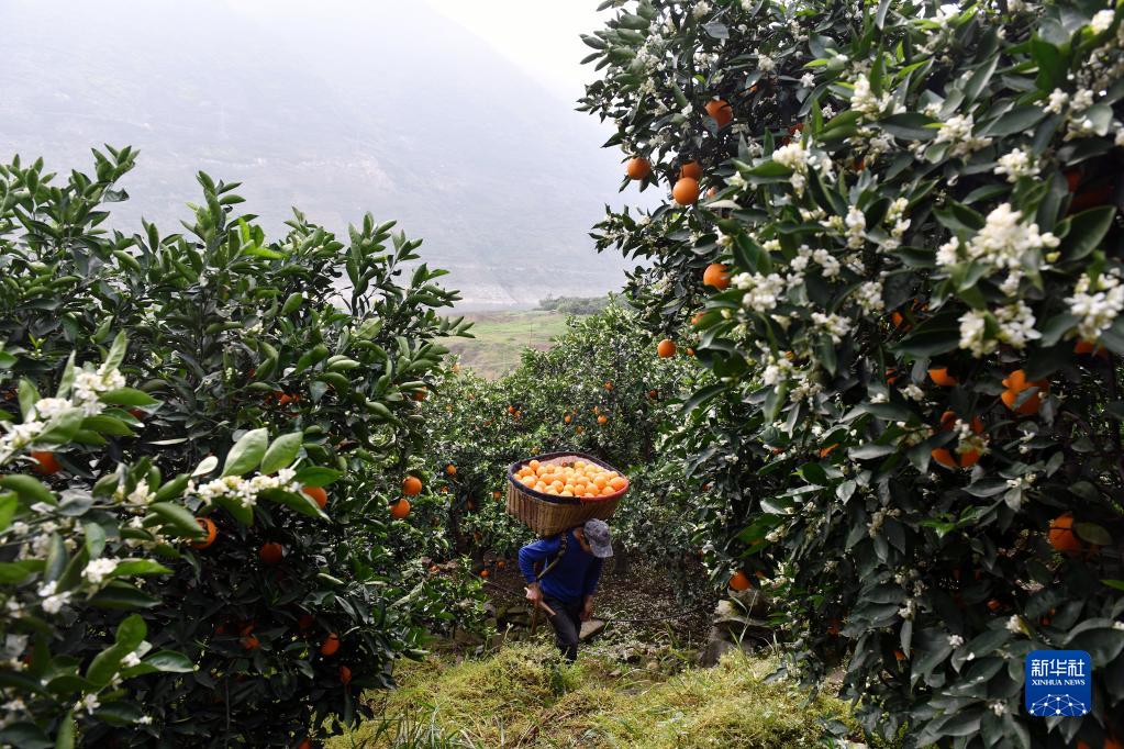 眼下,有“中国脐橙之乡”美誉的三峡库区湖北省秭归县长江两岸橙花盛开,晚熟脐橙挂满枝头,花果同树的橙树与峡江景观相映如画。