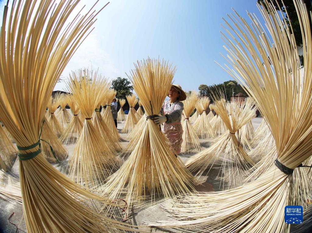 4月11日,在赤水市复兴镇太和村,工人晾晒竹丝。
