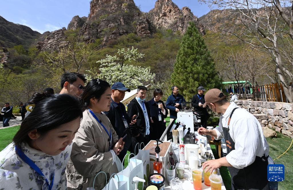 4月15日,游客在天津市蓟州区梨木台景区的特色市集上购买咖啡。