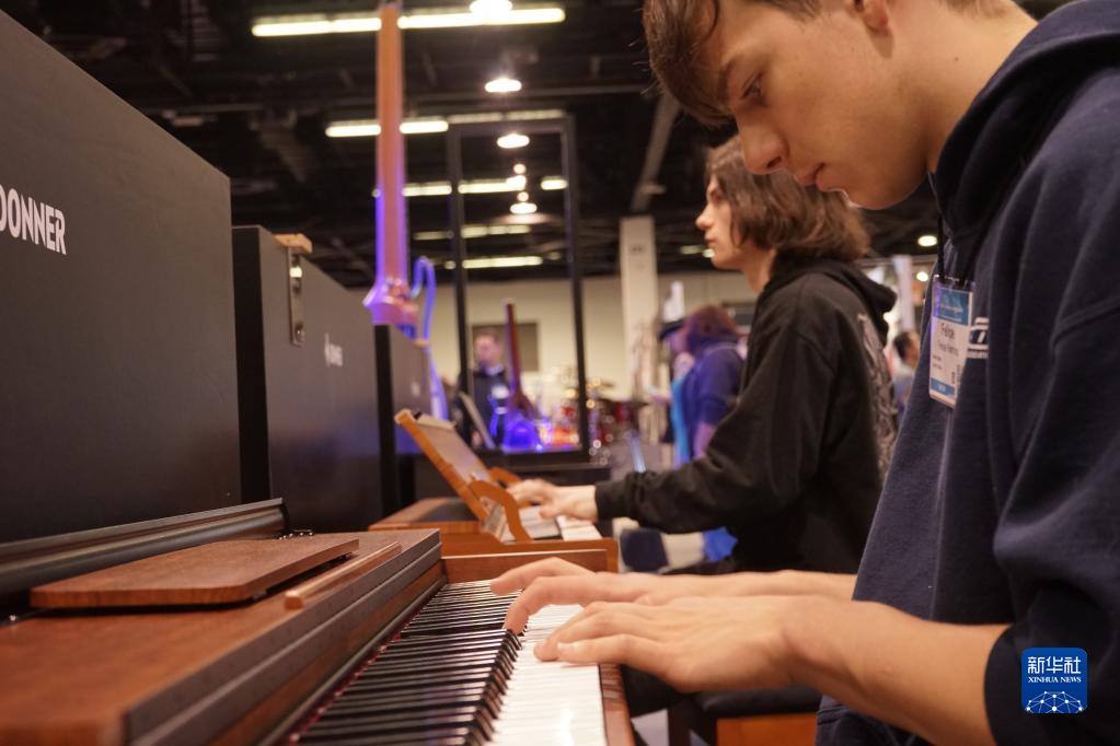 4月13日,在美国加利福尼亚州阿纳海姆会展中心,参观者在广州蓝深科技旗下“唐农”乐器展位试弹乐器。