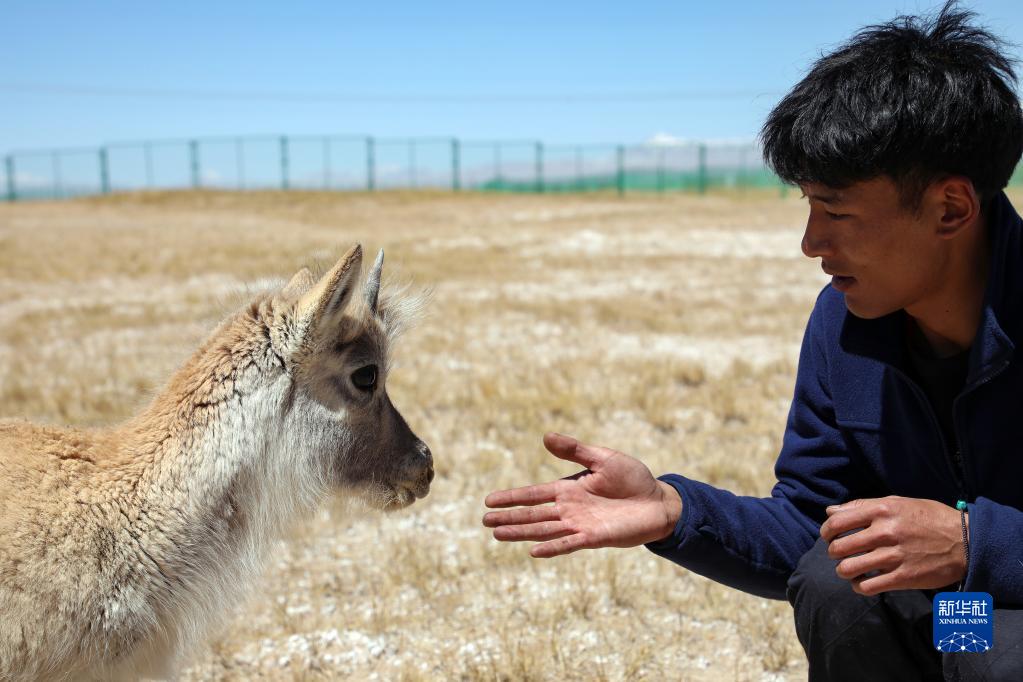 4月15日,索南达杰保护站巡山队员才文多杰与被救助藏羚羊幼崽互动。