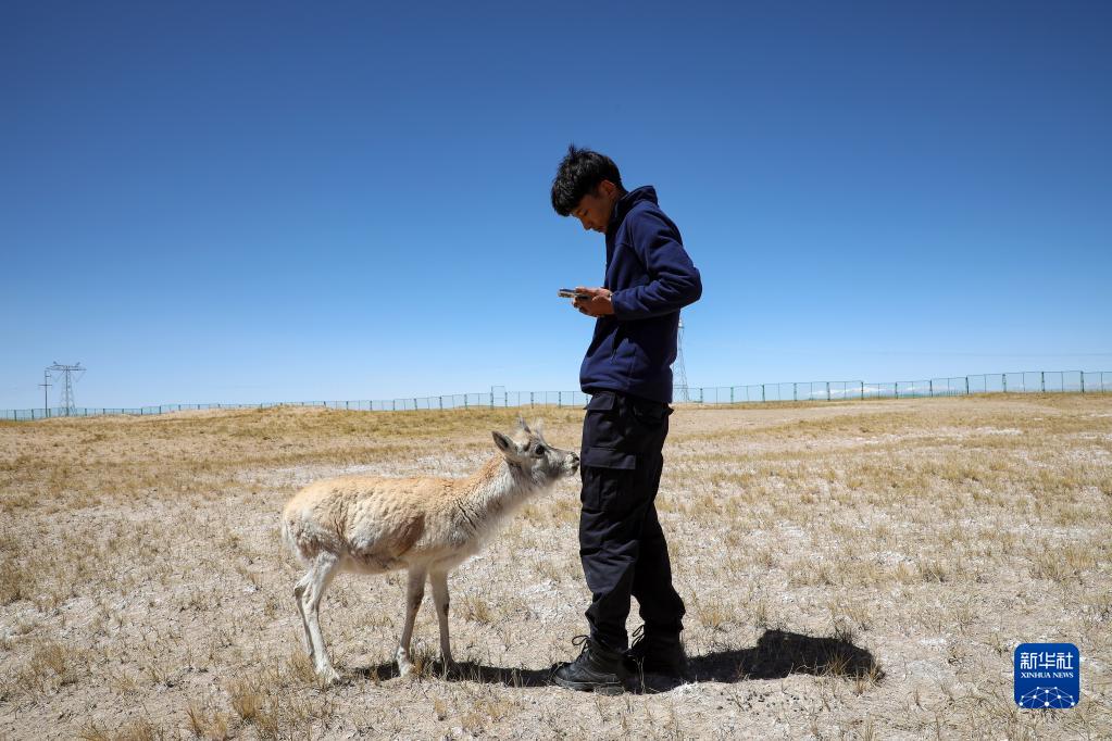 4月15日,索南达杰保护站巡山队员才文多杰在拍摄被救助藏羚羊幼崽的生长情况影像。