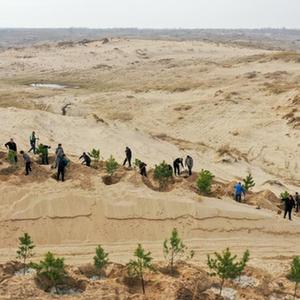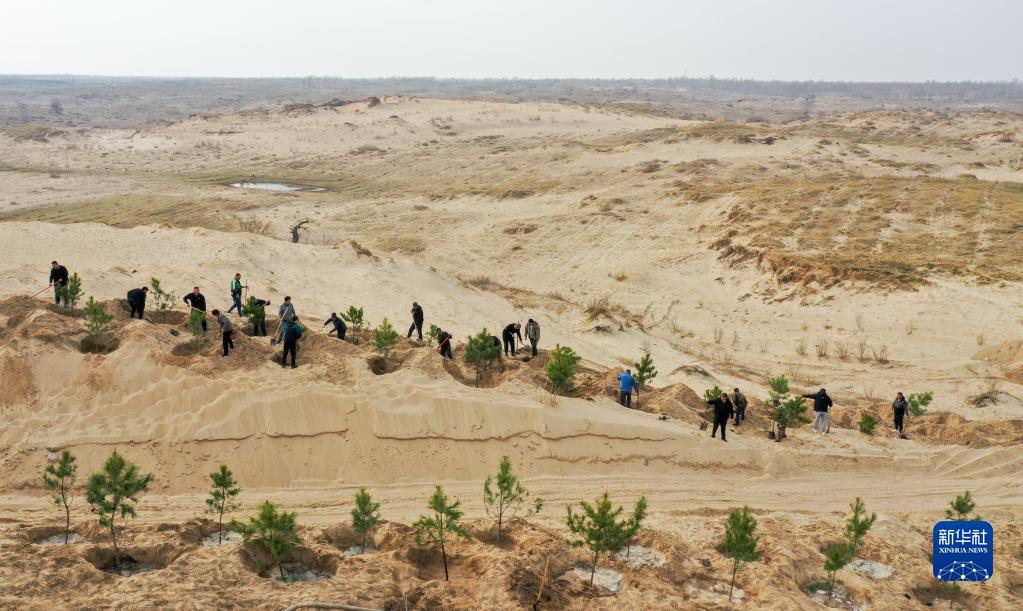 近日,在内蒙古通辽市科尔沁左翼后旗,治沙工人忙着植树造林,给科尔沁沙地披上“绿装”。科尔沁沙地横跨内蒙古、吉林、辽宁三省区,沙地面积7760万亩,在内蒙古通辽市境内占52.7%。近年来,依托“三北”防护林、退耕还林、公益林保护等重点生态工程,内蒙古通辽市不断加大植树造林、草原修复和生态保护力度,科尔沁沙地生态环境得到改善。