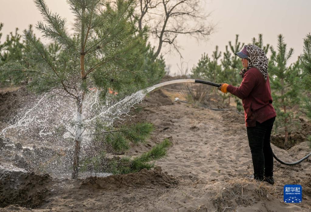 4月15日,在内蒙古通辽市科尔沁左翼后旗,治沙工人在科尔沁沙地给树木浇水。