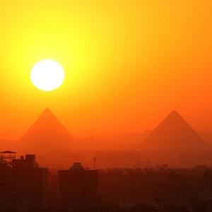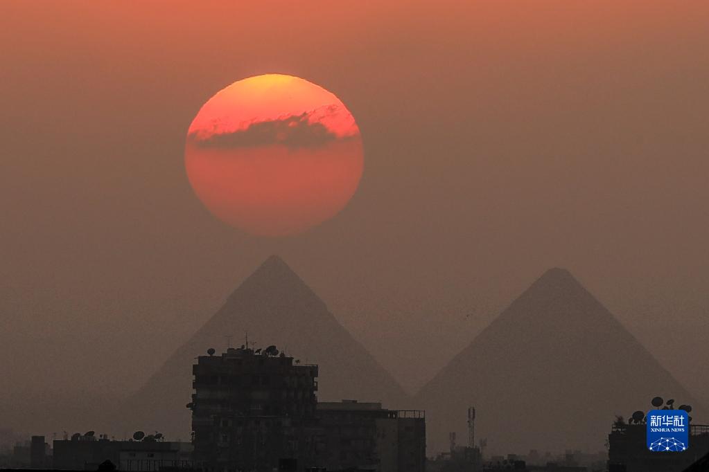 这是4月15日在埃及开罗拍摄的吉萨金字塔群日落景色。